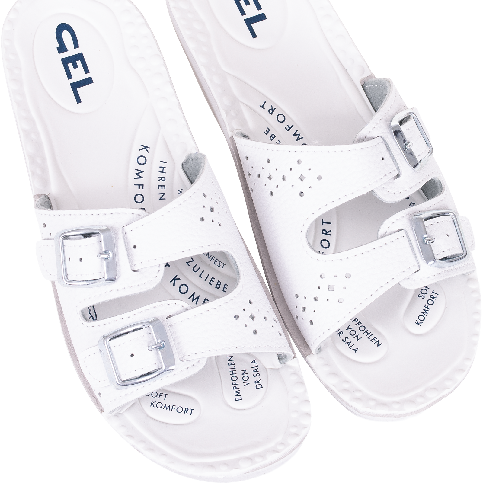 Wykonane z wysokiej jakości skóry ekologicznej, są lekkie, trwałe i łatwe w pielęgnacji. Dwa paski z regulacją na sprzączki pozwalają idealnie dopasować klapki do kształtu stopy, zapewniając stabilność i wygodę użytkowania. Profilowana, żelowa wkładka amortyzuje każdy krok i dba o komfort termiczny stóp w cieplejsze dni.