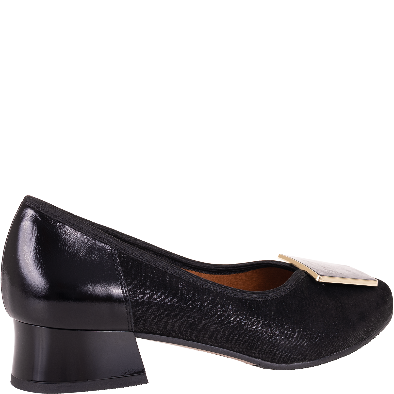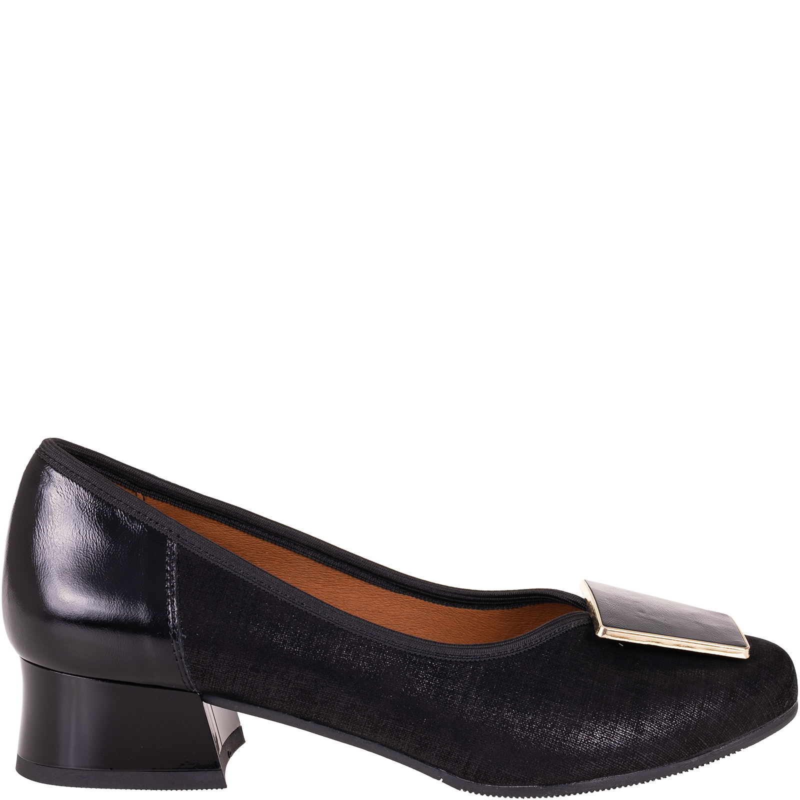 Na nosku znajduje się dekoracyjna aplikacja w formie kwadratowej klamry z metaliczną ramką, która subtelnie podkreśla elegancki styl buta. To detale sprawiają, że model SGO 1932 wyróżnia się na tle klasycznych czółenek.