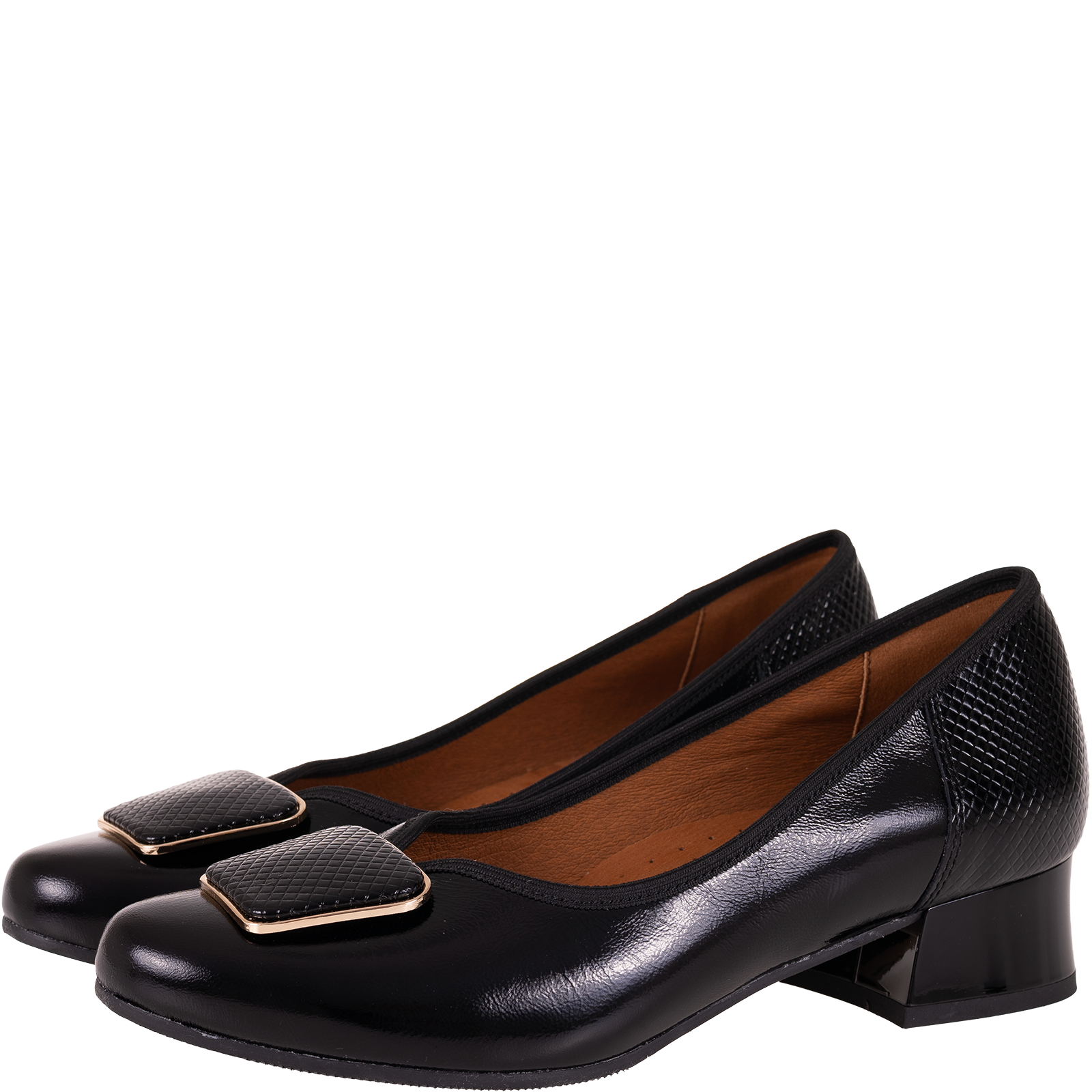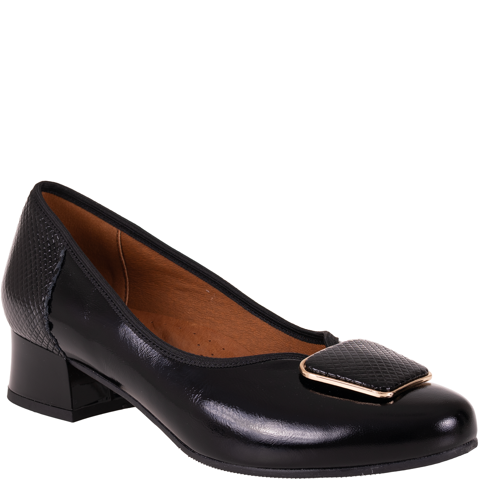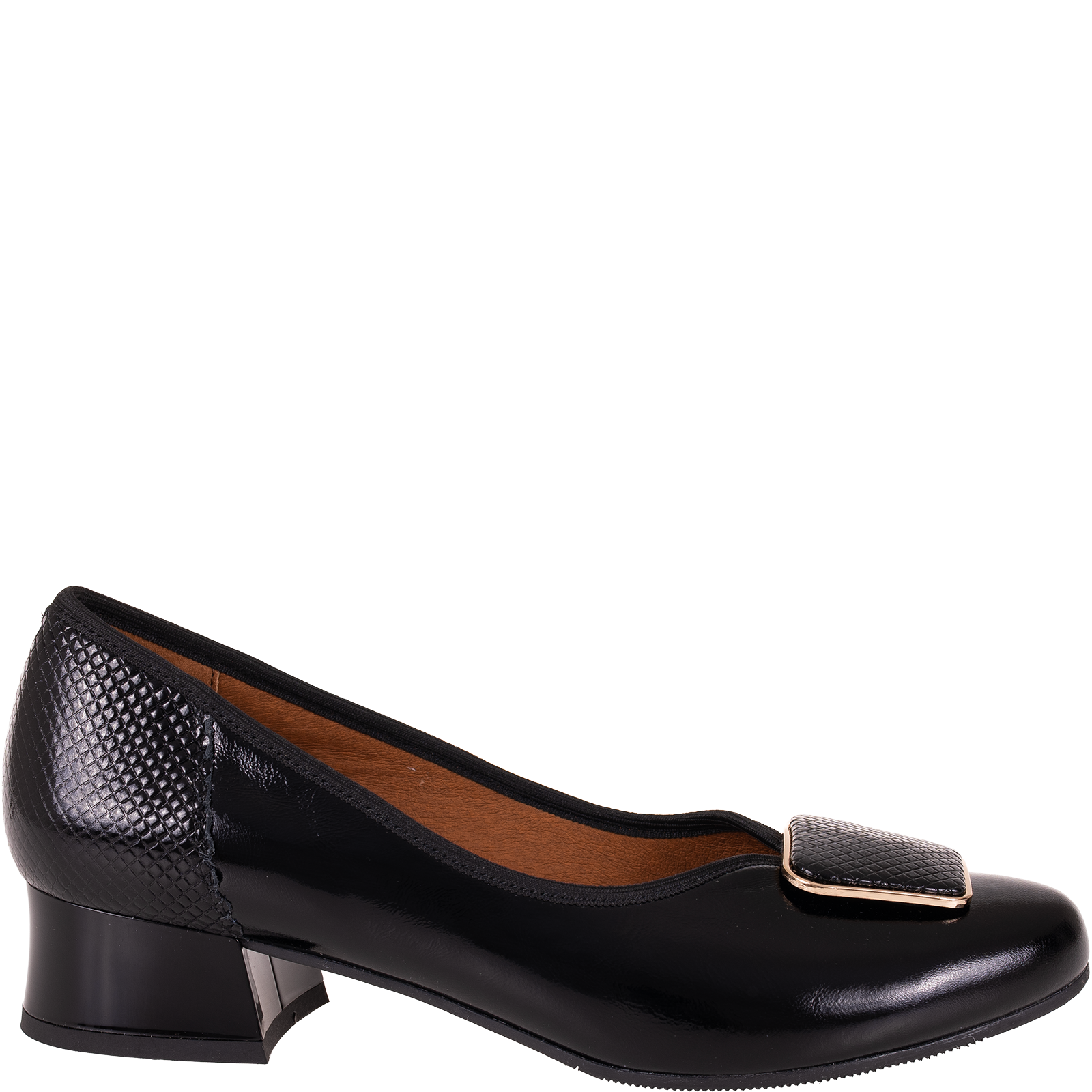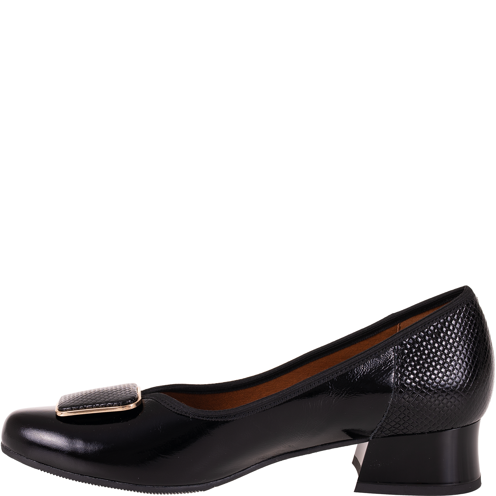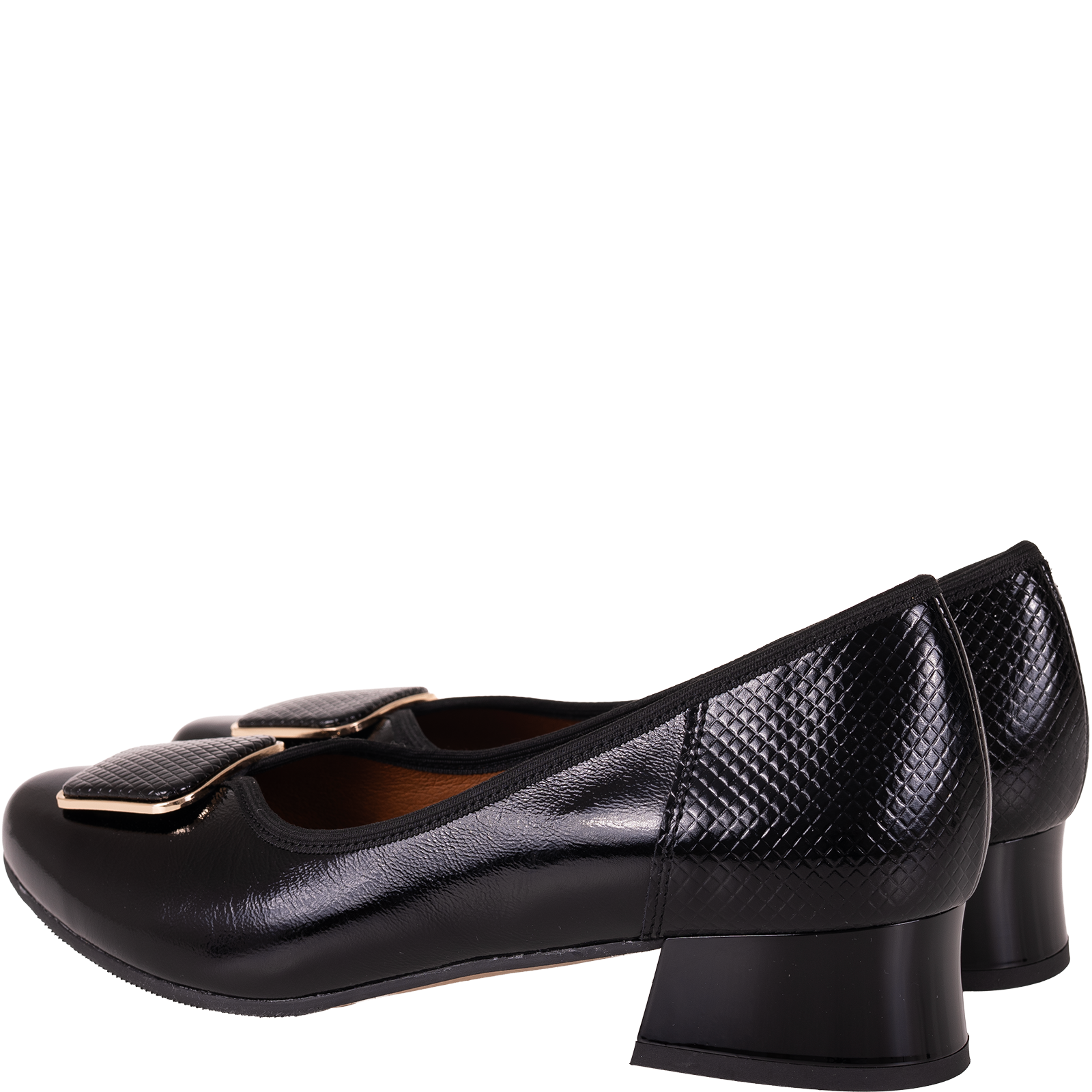 Na nosku znajduje się dekoracyjna aplikacja w formie kwadratowej klamry z metaliczną ramką, która subtelnie podkreśla elegancki styl buta. To detale sprawiają, że model SGO 2094 wyróżnia się na tle klasycznych czółenek.