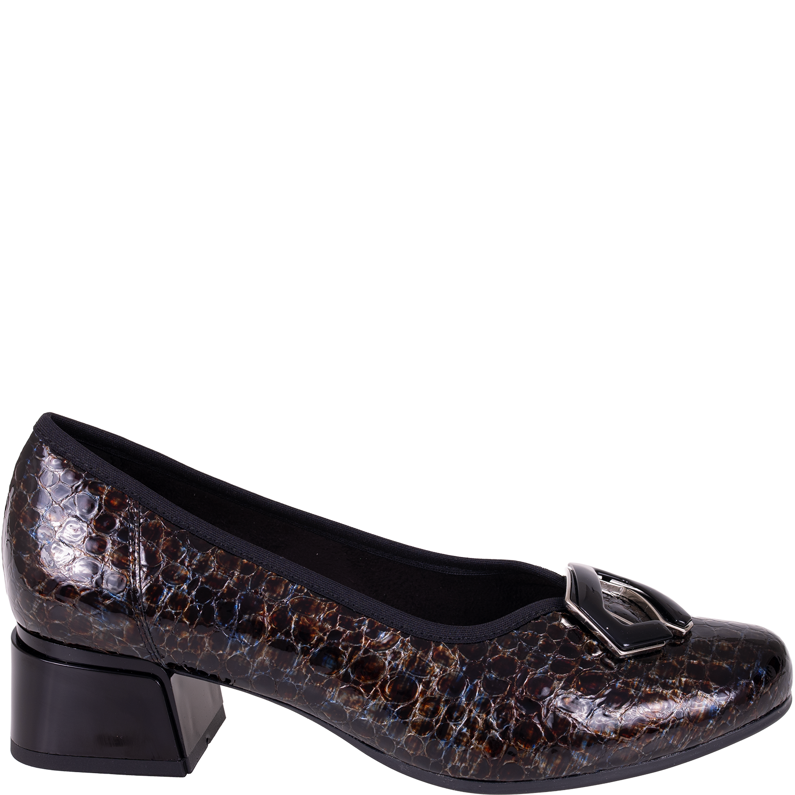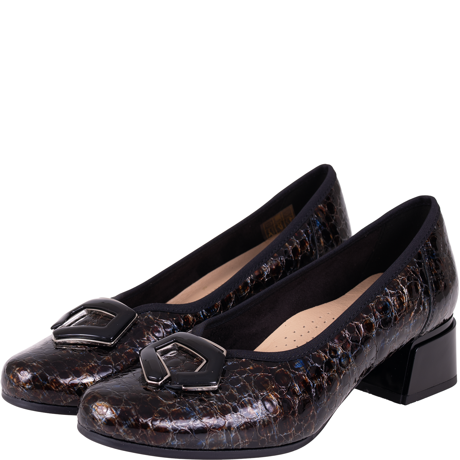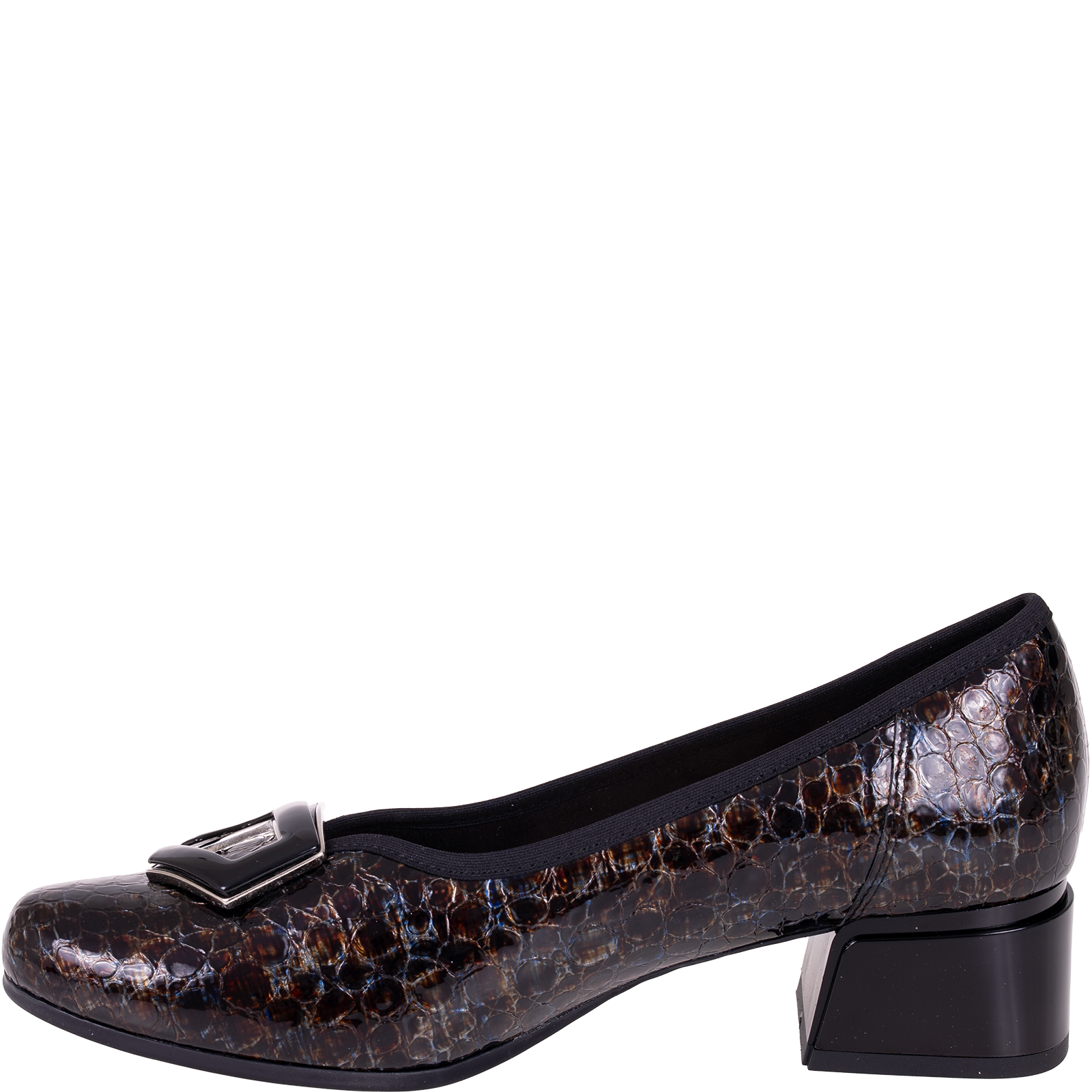 Cholewka przyciąga uwagę fakturą przypominającą łuski oraz wielowymiarowym połyskiem w odcieniach brązu, granatu i czerni. Zastosowana skóra lakierowana dodaje głębi oraz elegancji. Uzupełnieniem całości jest ozdobna aplikacja w ciemnym połyskującym kolorze, która podkreśla kobiecy charakter obuwia.