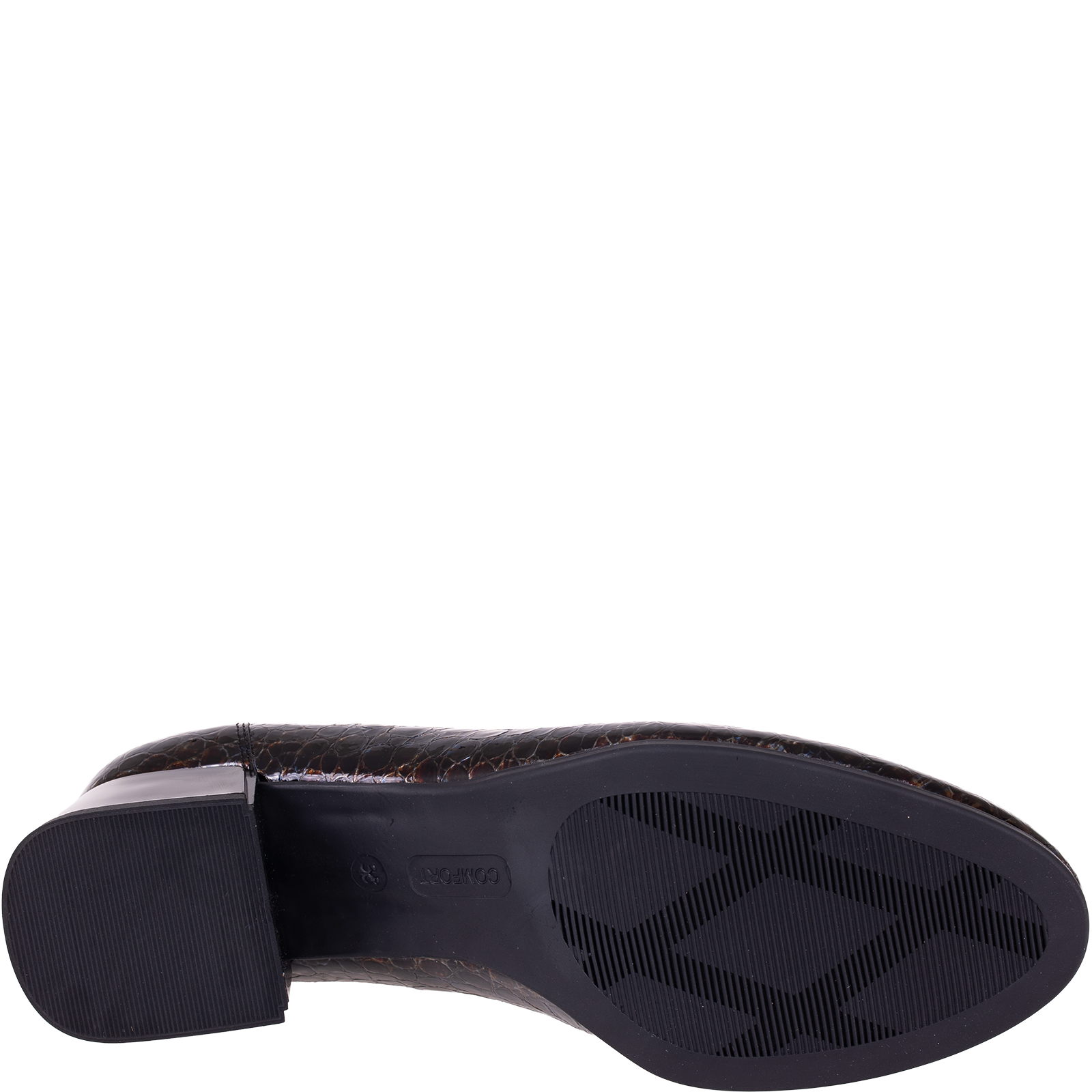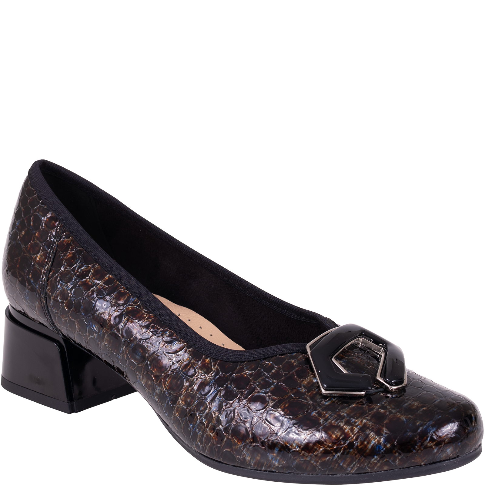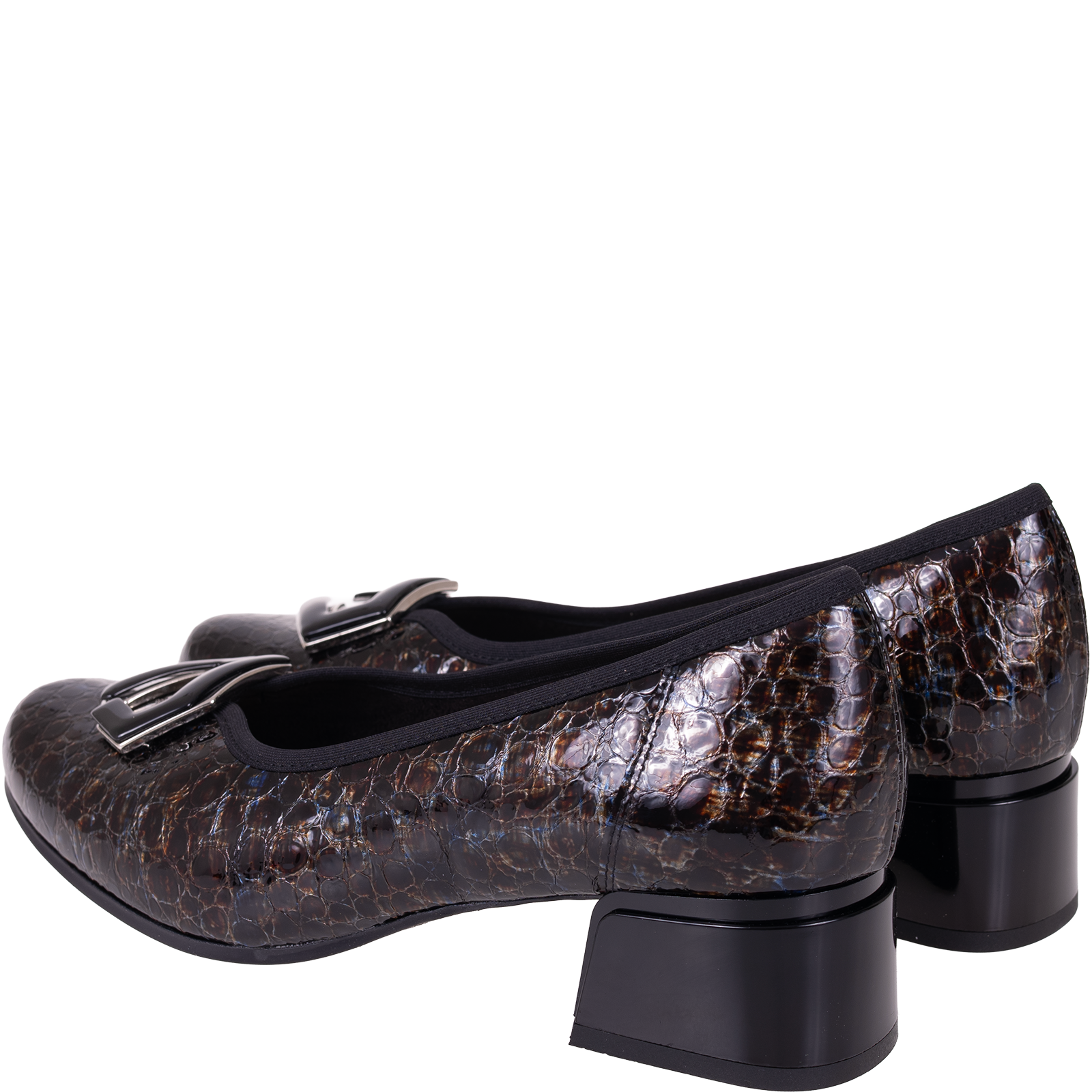 Cholewka przyciąga uwagę fakturą przypominającą łuski oraz wielowymiarowym połyskiem w odcieniach brązu, granatu i czerni. Zastosowana skóra lakierowana dodaje głębi oraz elegancji. Uzupełnieniem całości jest ozdobna aplikacja w ciemnym połyskującym kolorze, która podkreśla kobiecy charakter obuwia.
