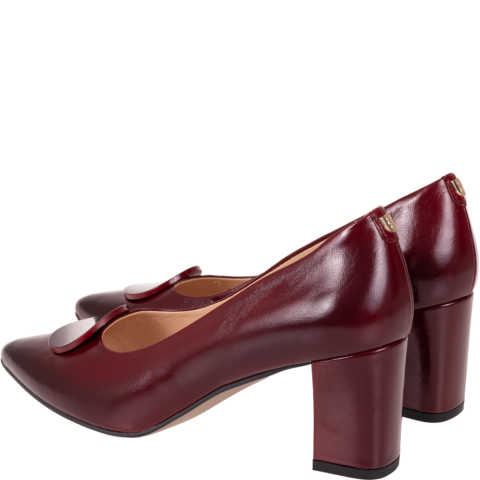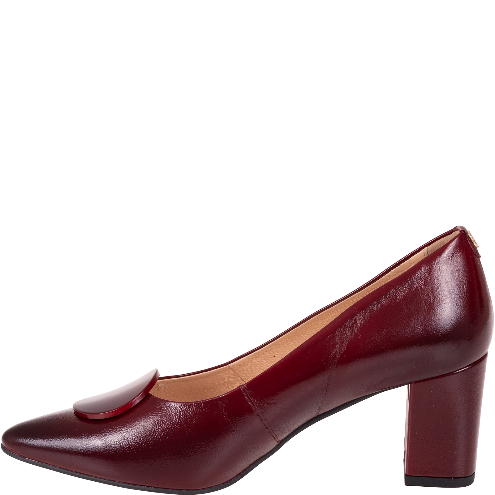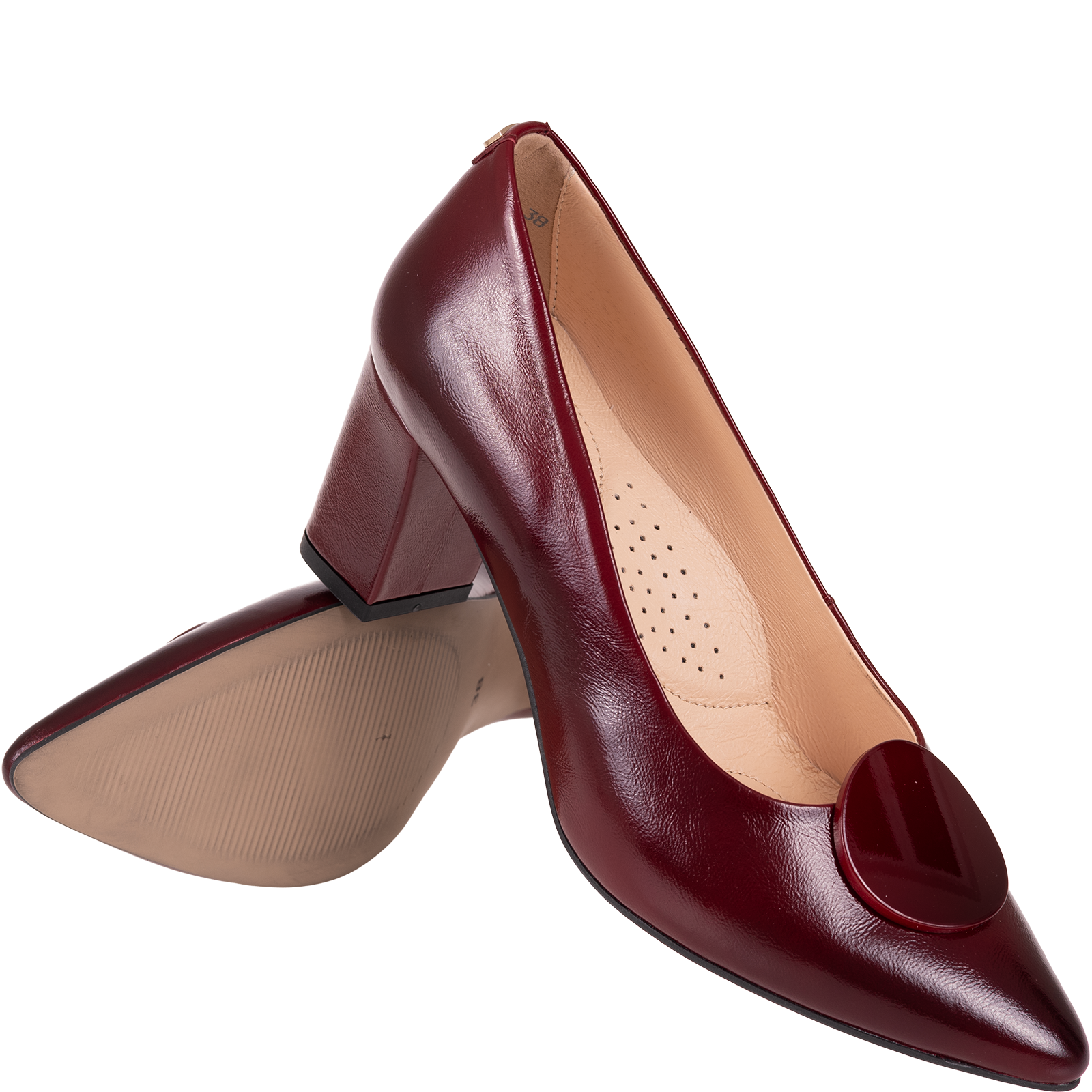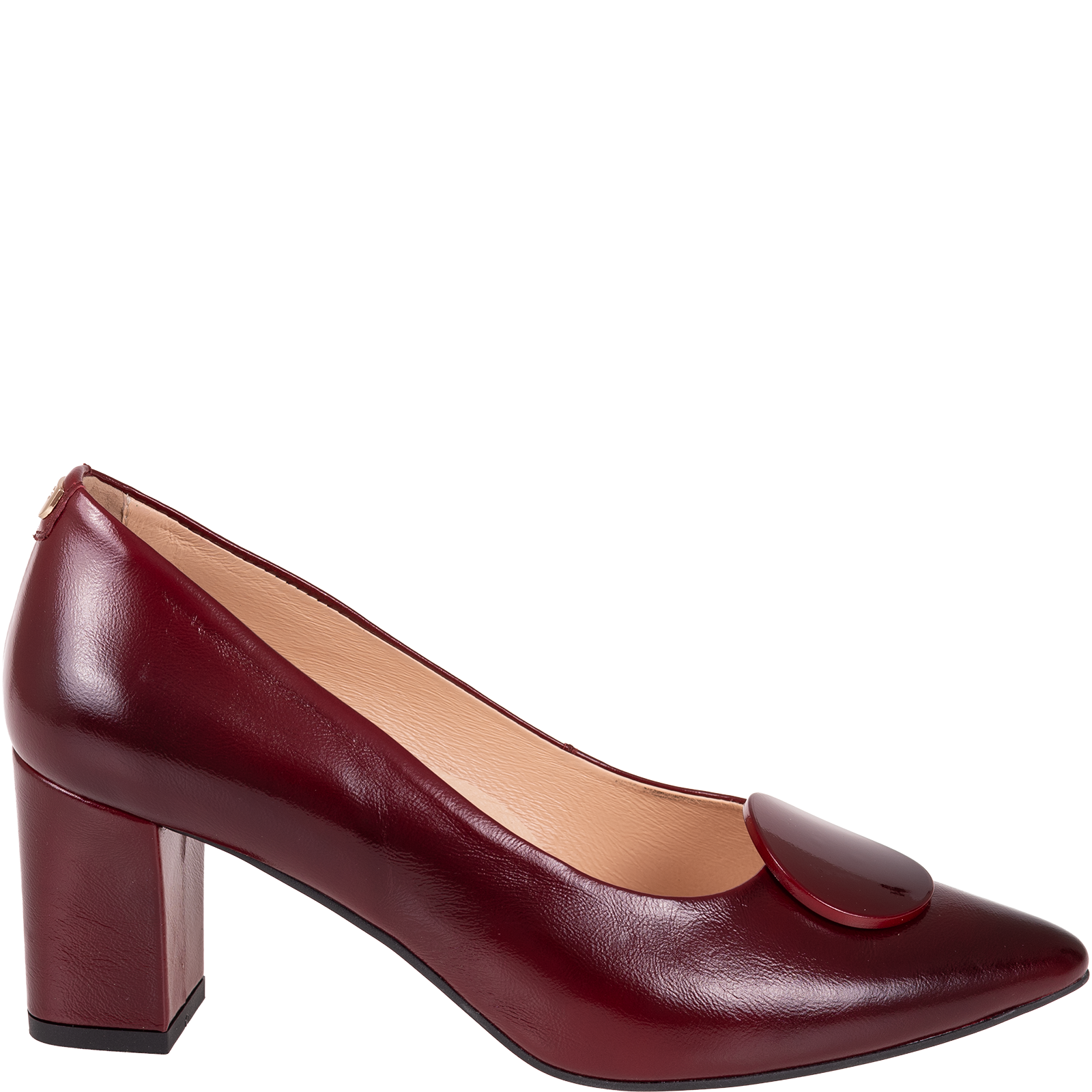 Charakterystyczna, lakierowana ozdoba w formie okrągłej aplikacji umieszczona z przodu cholewki dodaje butom oryginalności i przyciąga wzrok. To subtelny, ale zauważalny element, który wyróżnia ten model spośród klasycznych czółenek.