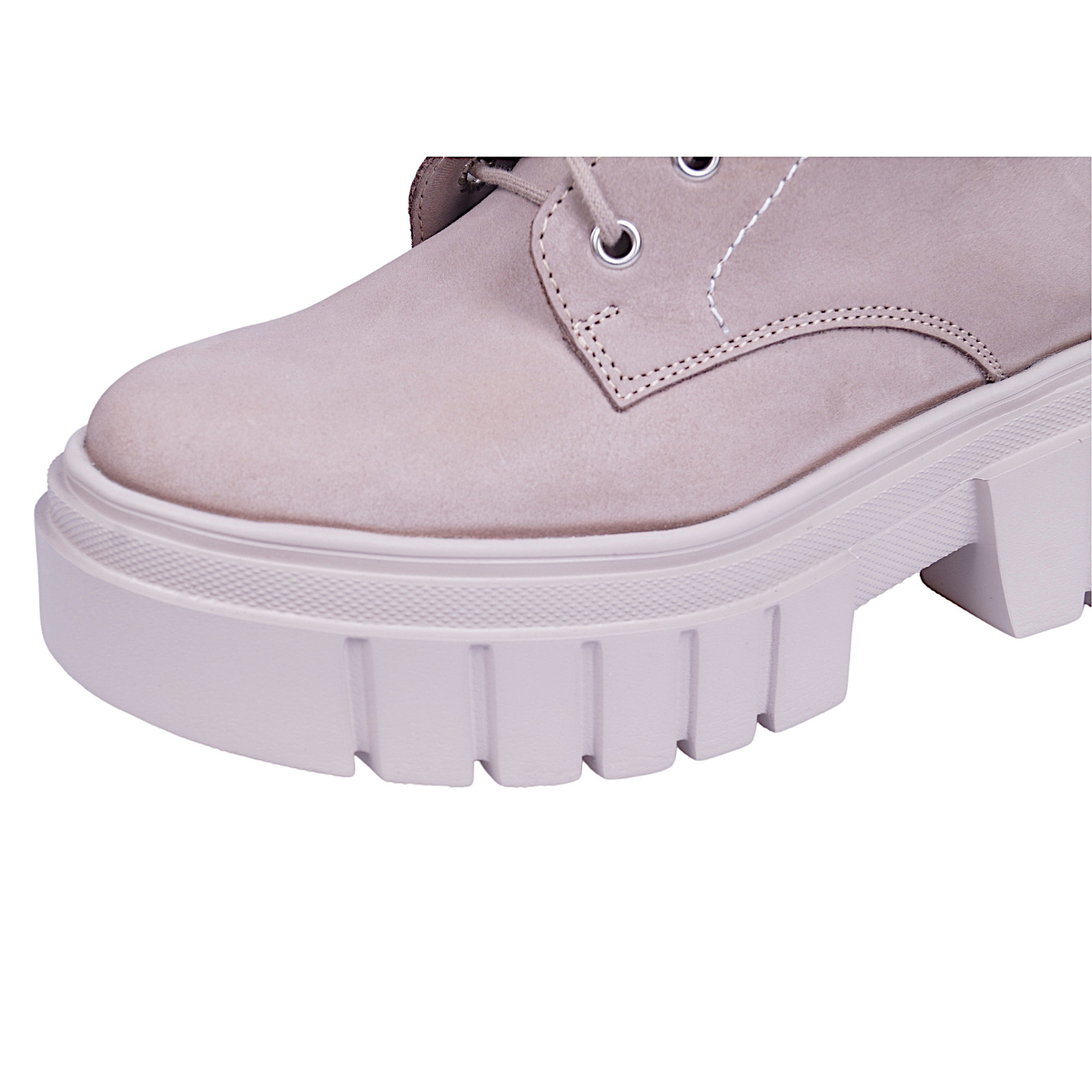 Trzewiki damskie z najnowszej kolekcji wykonane w 100 % z najlepszej jakości skóry naturalnej nubukowej w kolorze cappuccino. Obuwie pięknie prezentuje się na nodze, mimo swojego grubego spodu buty są bardzo lekkie, porządnie wykonane.