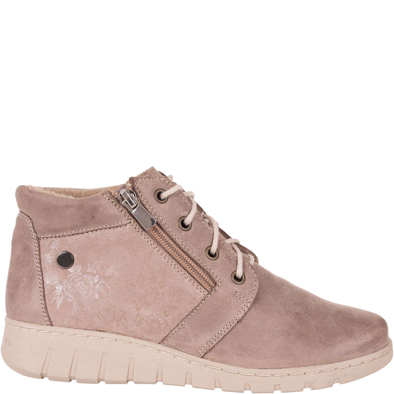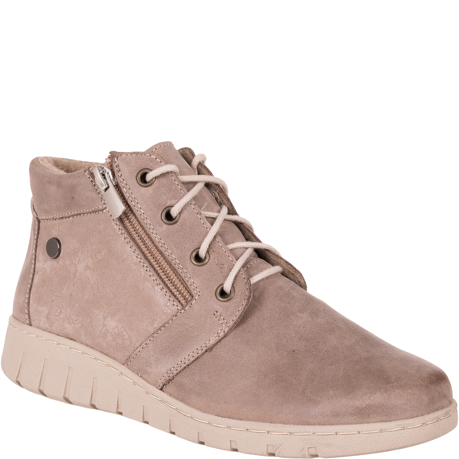 Buty posiadają podwójny system zapięcia – tradycyjne sznurowanie pozwala dopasować obuwie do kształtu stopy, a boczny zamek błyskawiczny umożliwia szybkie zakładanie i zdejmowanie. To praktyczne rozwiązanie dla kobiet ceniących wygodę i funkcjonalność w codziennym użytkowaniu.